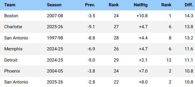 完毕本日赛前,黄蜂本赛季百回合净胜敌手4.7分,排在联赛第6。要知谈上赛季黄蜂还以-9.1的百回合净胜分名次定约倒数第4。短短一年时分,黄蜂将百回合净胜分进步了13.8分,这在NBA干涉play-by-play数据期间的30年里高居第二,仅次于2007-08赛季构成加内特、皮尔斯、雷·阿伦三巨头的凯尔特东谈主(进步14.3分)。
